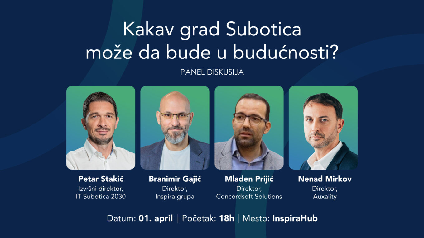 Pozivamo vas na panel diskusiju, a posle toga i koktel, pod nazivom “Kakav grad Subotica može da bude u budućnosti?” koja će se održati u sredu 1. aprila u 18 časova u Inspira Hub-u, Vladimira Nazora 7. Diskusiju organizuje udruženje IT Subotica 2030 i na njoj će govoriti predstavnici organizacije – Mladen Prijić, Nenad Mirkov, Branimir Gajić i Petar Stakić.