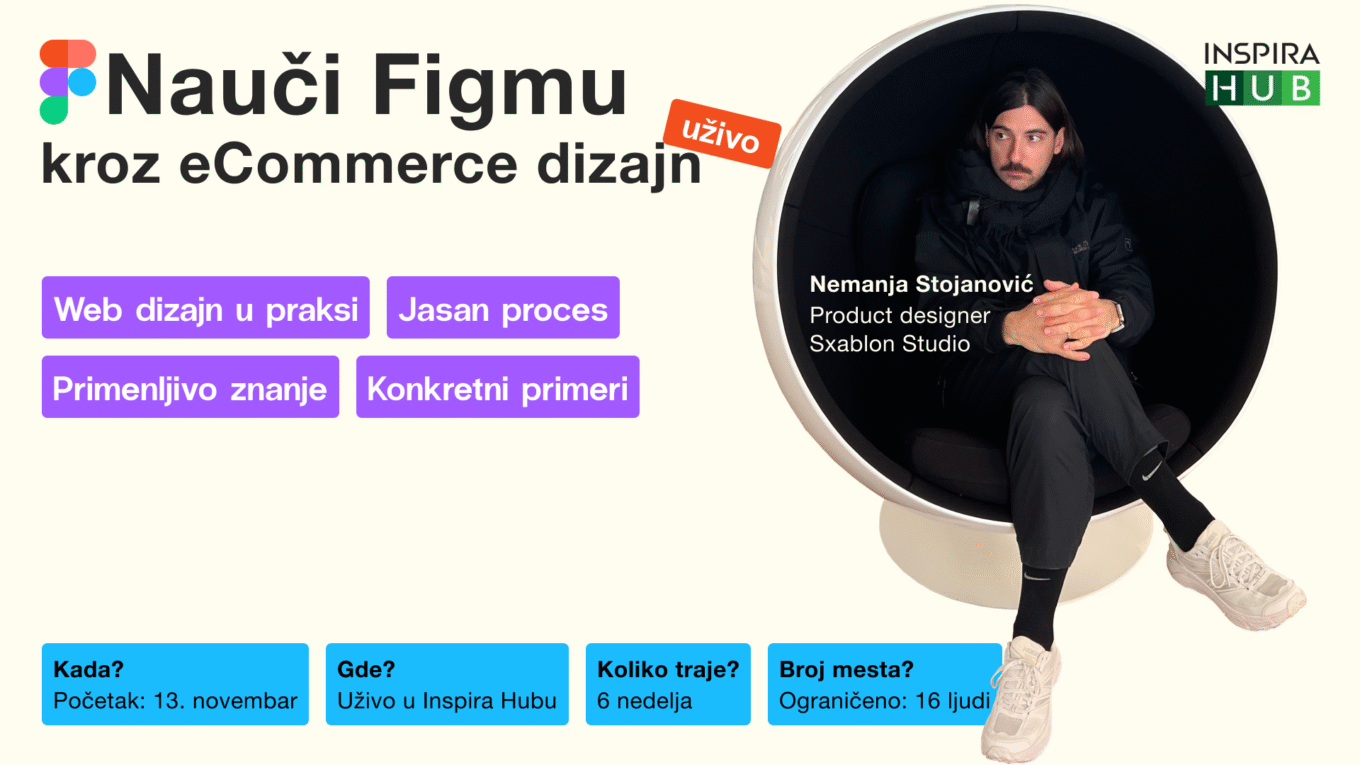 Radionica je namenjena svima koji žele da nauče kako se u Figmi vodi realan digitalni projekat od grida i tipografije do mini dizajn sistema. Kroz šest nedelja zajedničkog rada izgradićemo eCommerce sistem koji se može koristiti kao portfolio ili case study.